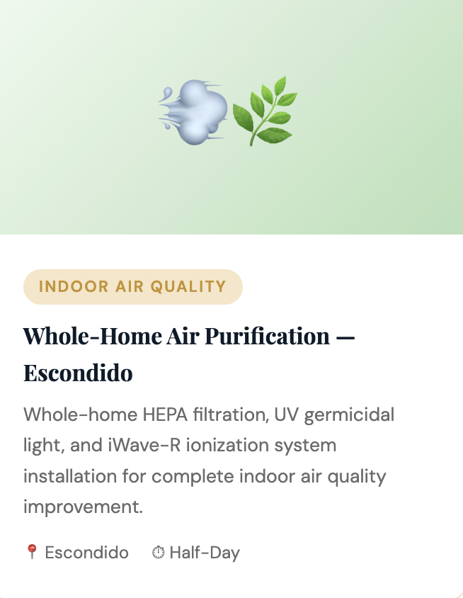 "Their IAQ assessment revealed serious ductwork problems. After the duct replacement and air purifier install, the difference was night and day. My allergies have improved significantly."